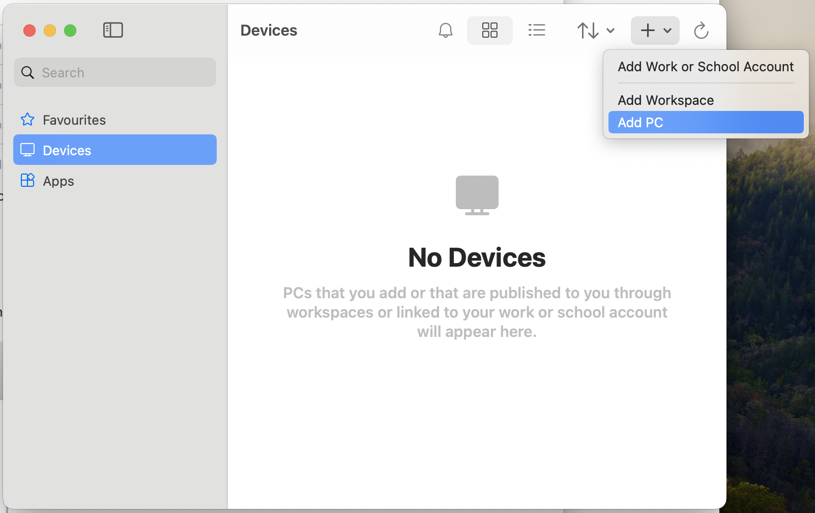 - Open Windows App from the Applications folder and click on the New (+) button and select Add PC.