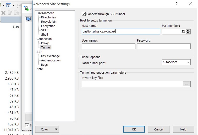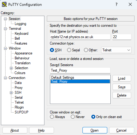 ContentAccess to Linux machines within the Department must be done via the bastion server which is available for external access. GUI toolsPutty program to access linux machines from Windows. It will be installed on Department provided Windows computers or you can install it from self-service or from here: https://www.chiark.greenend.org.uk/~sgtatham/putty/. Command line toolOpenssh client is now including as standard on Windows 11 follow the Linux SSH How to access via the bastion serverThe current version Putty version 0.83 at the time of publication allows the setup of an ssh proxy using bastion.physics.ox.ac.uk.